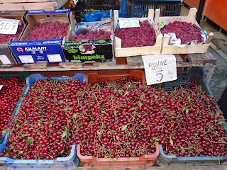 2 Kg di ciliege amarene, 1 Kg di zucchero.Pulite le ciliege le ho messe nel vaso, uno strato di ciliege ed uno di zucchero terminando con lo zucchero le metterò al sole fin quando no si sarà sciolto tutto lo zucchero. Poi aggiungerò un litro di alcol 96°.Le ciliege amarene "visine" in "piata mica" piccola piazza vicino dove abito.