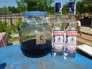 Oggi sabato 9 luglio ho aggiunto ad ogni vaso 1 L. di vodka bianca 40° (ingredienti: alcol 96° distillato dal grano, diluito con acqua demineralizzata - made in Italy)